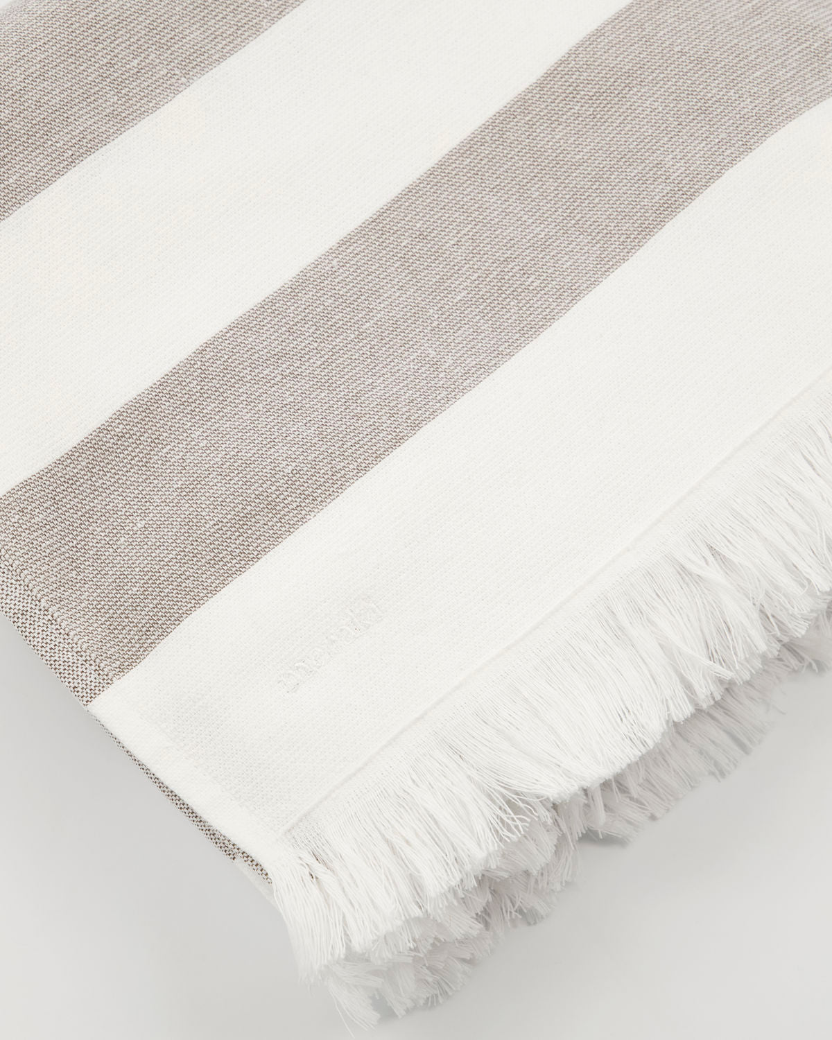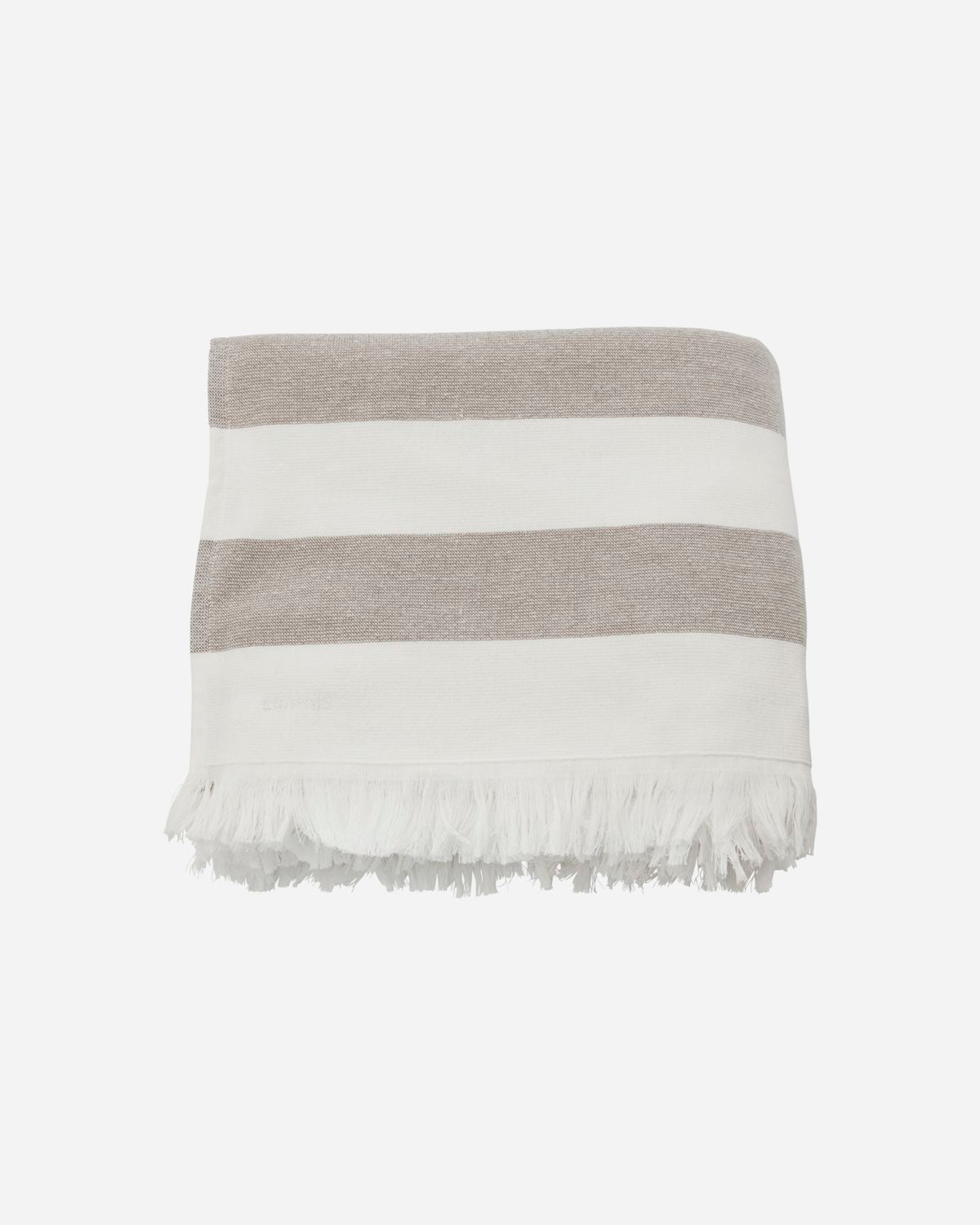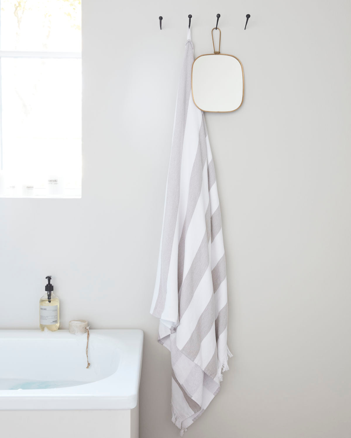 Handdukar är ofta det som får ditt badrum att kännas enhetligt. Så är verkligen fallet med strandhandduken Barbarum av Meraki. Linda in dig i den här stora och mjuka bomullshandduken efter ett avkopplande bad, och avsluta din kvällsrutin på topp. Den ena sidan kommer med en normal vävning medan den andra består av en otroligt mjuk frottéväv. Breda ränder i neutralt vitt och brunt tillsammans med fina fransar bidrar tillsammans med en lyxig känsla. Komplettera din badrumsinredning med mindre handdukar i samma design.
